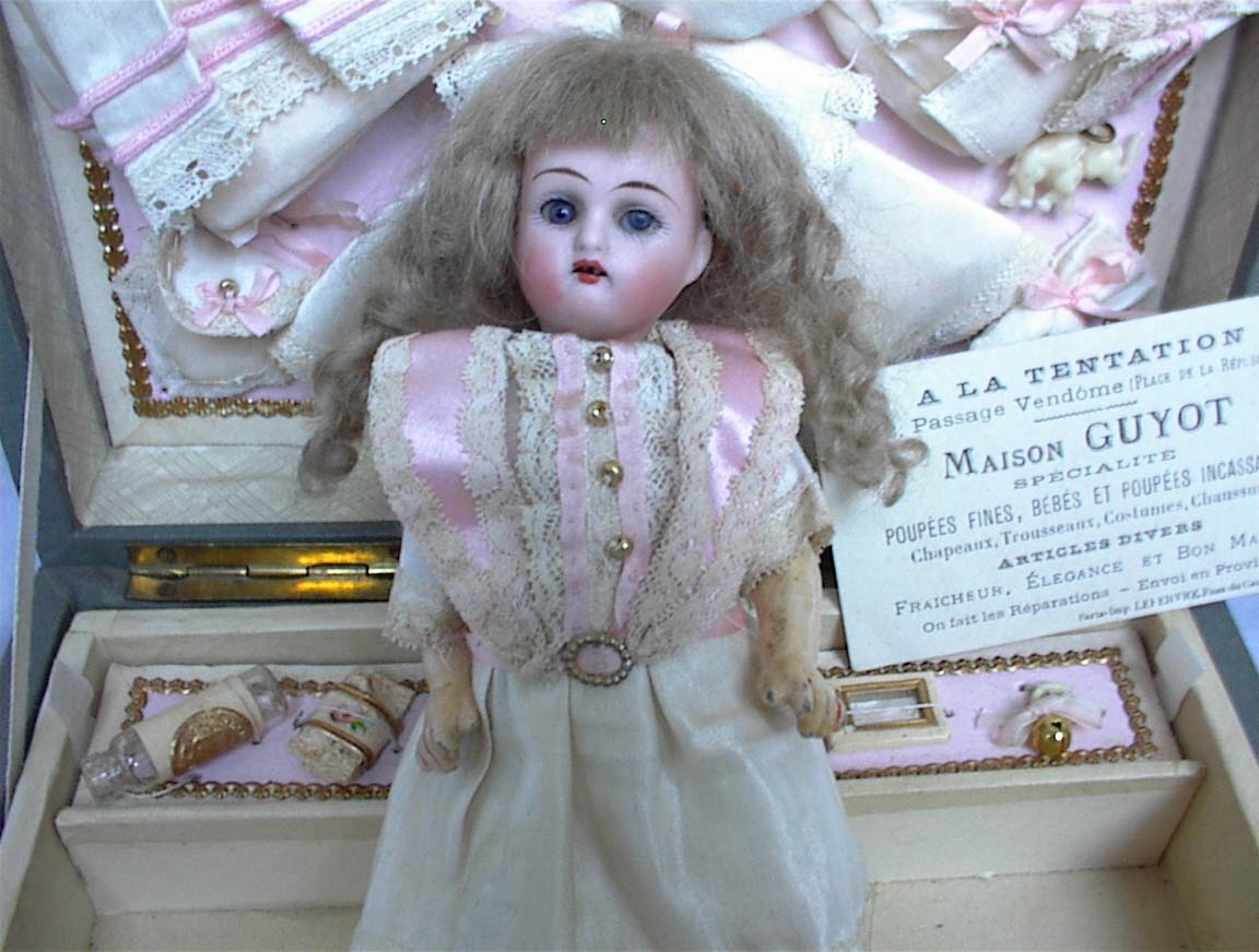 Outstanding French Presentation trunk with original store card included.. The store card translates as follows: “ Guyon Company, Specializing in fine dolls, baby dolls and unbreakable dolls. Hats, trousseaux, outfits and shoes, miscellaneous items. “New elegant and affordable,(Bon Marche)”. We do repairs and deliver outside of Paris”. Masion Guyot 6 1/2" super little K * R 192 walker girl, is surrounded on both sides with an assortment of darling sized fripperies. Comb and brush, watch, binoculars, mirror, necklace, purse, bottles, etc. Exquisite clothes are on the inner cover, and lift the tray to find all her undies, bedclothes and chapeaus. Finest workmanship, a sight to behold. The trunk itself is a work of art. Leather straps adorned by metal clasps. Brass handles on both sides for lifting. 8" L X 6" W and 4 1/2" D. Just opening it is breathtaking.