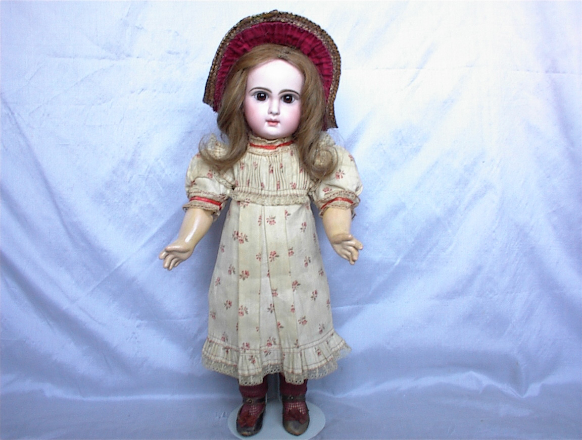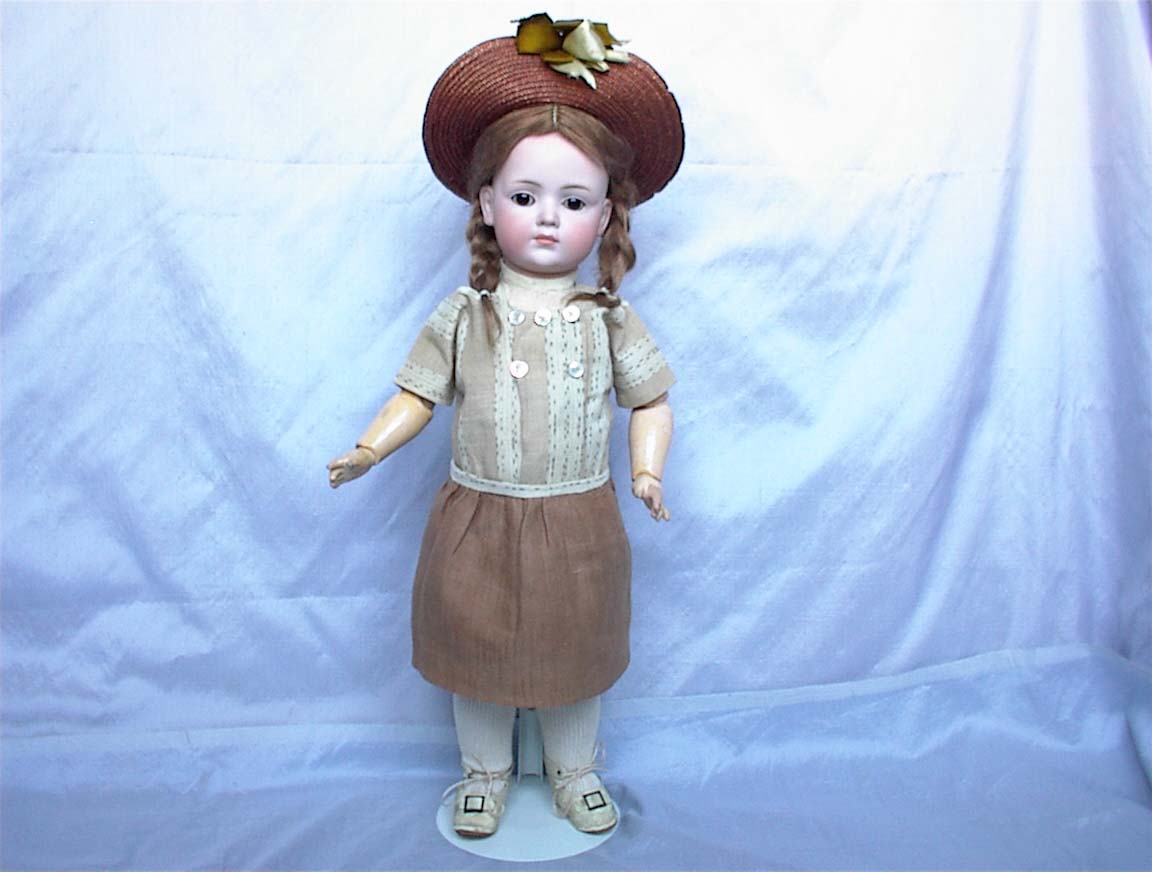 17” Kley & Hahn 546 Character Child with glass eyes.Wonderful original example of a very endearing child. Perfect bisque, great modeling, brown glass sleep eyes, perfectly painted features and big huge pouty lips to envy. Original auburn braided wig and pate. Matching slip and undies. Her outfit is that of a typical school girl of the times. White leather antique shoes and socks. Her antique straw burgundy hat completes her.