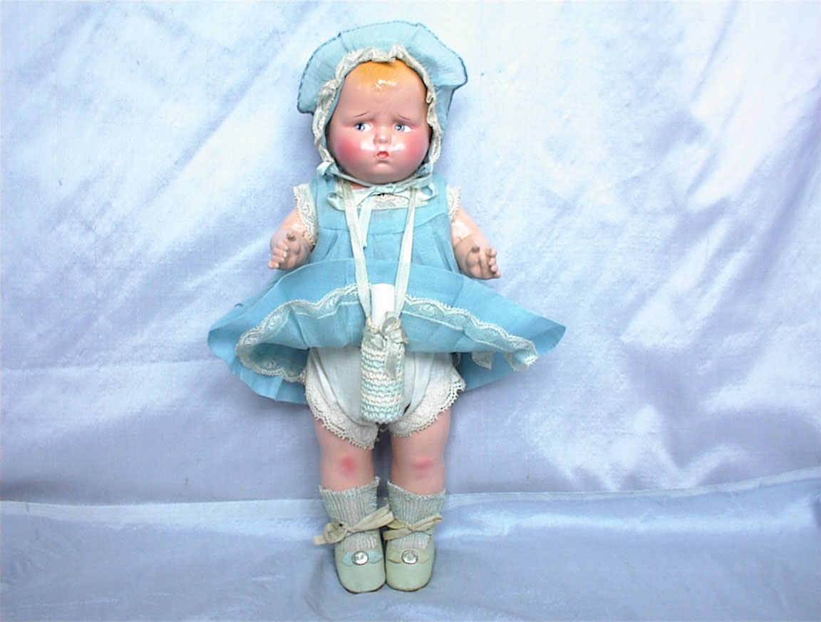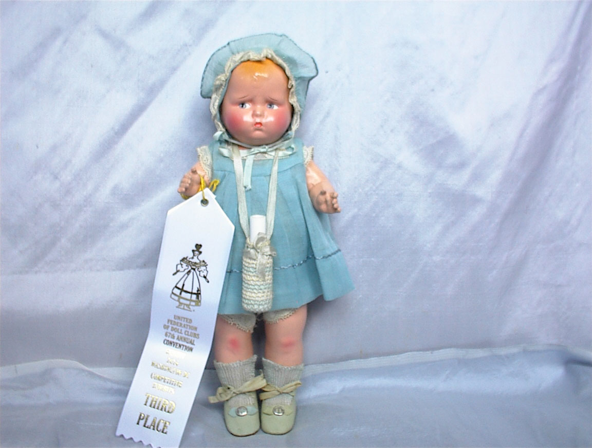 12” Effanbee “Grumpykins” Circa 1927 with UFDC Ribbon. One look and you will know why this little Grumpy won a ribbon in competition at UFDC in Washington DC this year. Pristine example looks like he just walked out of the factory! Marked on back of shoulder plate: Effanbee Dolls, Walk Talk Sleep. Composition head and shoulder plate, jointed composition limbs and a stuffed cloth body with a non working crier. Just look at that face! Factory original from tip to toe.