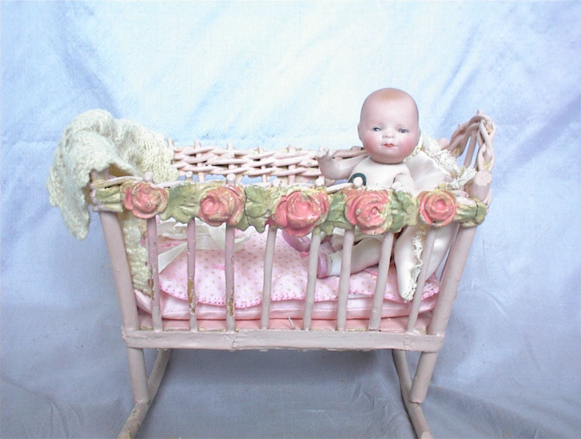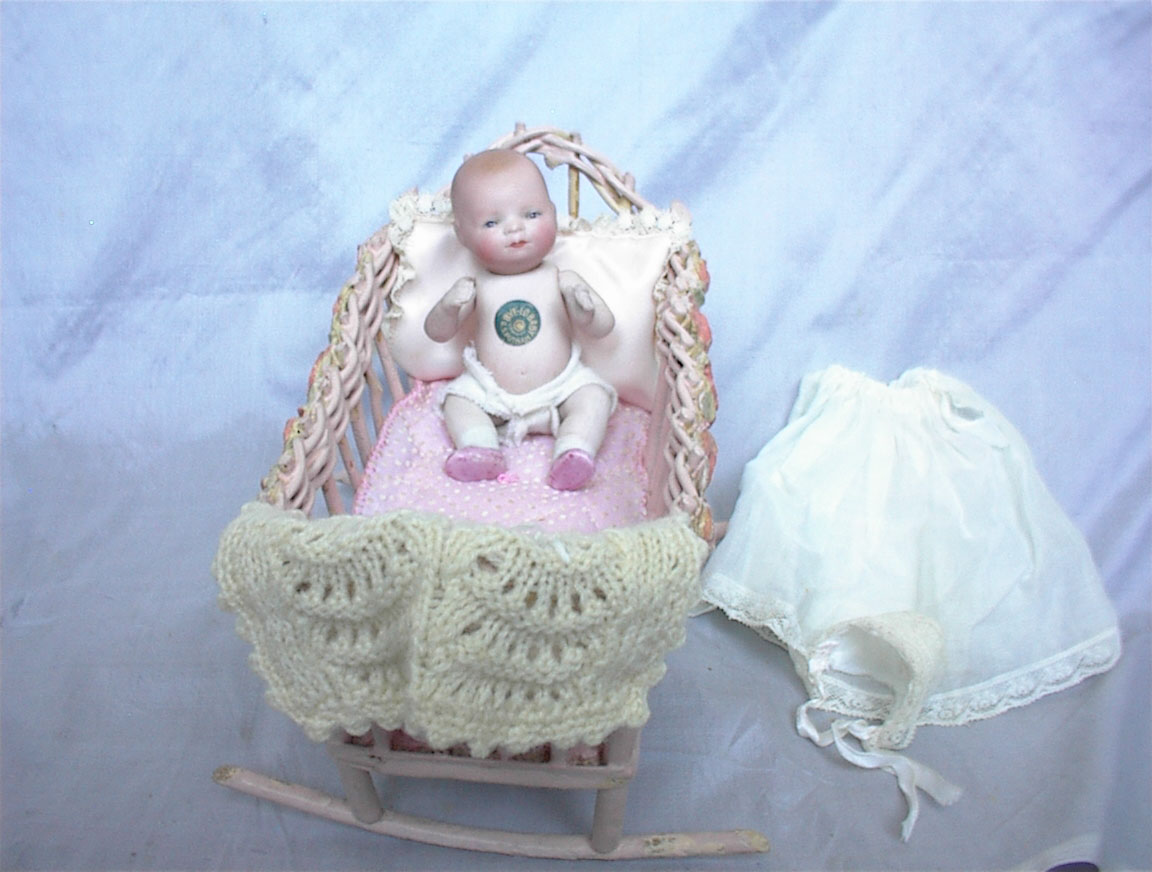 5”All Bisque Bye-lo baby with pink cradle. What an adorable little baby girl! Swivel head, blue sleep eyes, original label on tummy, painted pink shoes and white socks! She wears her diaper, but comes with an antique gown, slip and bonnet. She also comes with her too precious pink vintage cradle, (8” L x 4 1/2” W x 6”H), crochet blanket, pink mattress with tiny quilted cover and a satin pillow. Just a charming little cherub.